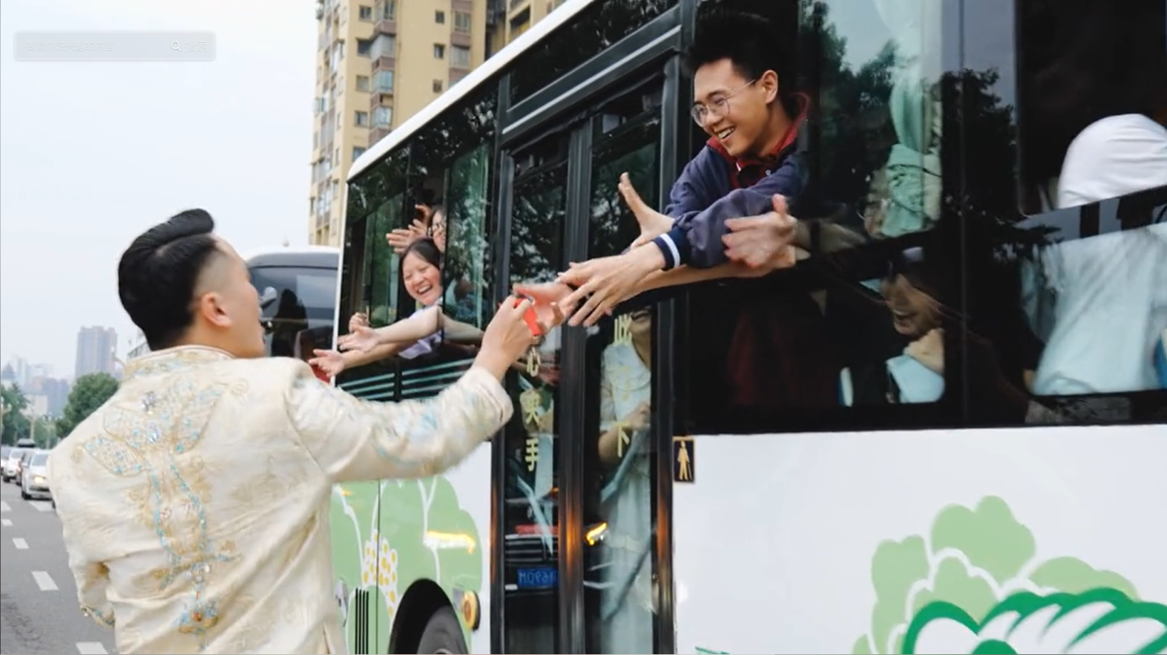 王洪鑫說:“從旁邊路過時,學子們從車窗里伸出頭和手來,大呼:‘新婚快樂!’新郎拿著紅包挨個給孩子們回禮,同時回復高考加油,一定要好好考。場面非常熱鬧和喜慶。”期間車隊師傅也很貼心地放緩了車速,確保行車安全。