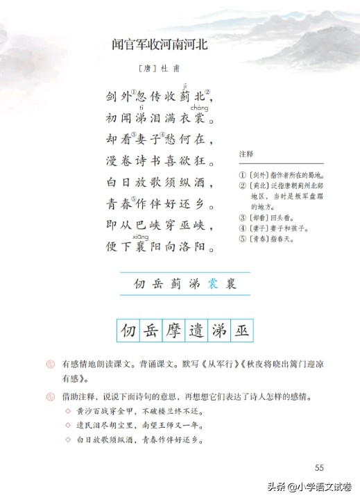 《聞官軍收河南河北》作者是唐代詩人杜甫,這是一首七言律詩,詩人寫這首詩的時候,朝廷的軍隊已經收復了洛陽等地,長達數年的“安史之亂”即將結束,身在蜀地的杜甫聽聞這一消息,不僅欣喜若狂,于是寫下了這首詩。詩的大意是:身在蜀地時,忽然聽聞薊北被收復的消息,不禁淚灑衣衫,回頭看到妻兒也一掃愁容,隨手卷起書本,內心欣喜若狂。在白天便高歌痛飲。想著正好趁春天啟程返鄉,可以從巴峽穿過巫峽,再順流而下到襄陽,去往洛陽方向。本詩開篇便點出了寫作的緣由。即“劍外忽傳收薊北”。“劍外”是詩人當時所在的蜀地,“薊北”則是當時叛軍的根據地,“忽傳”寫出了捷報到來的突然,因此詩人驚喜莫名,以至于剛一聽到便涕淚如雨。“涕淚滿衣裳”里,既有對戰亂將息、百姓終于可以安定下來的欣慰之情,也有對自己數年來顛沛流離、終于可以回歸家園的感慨之意,更有對回憶多年離亂的痛切之情,詩人悲喜交集的復雜感情,都濃縮在這短短的五個字中了。接下來,詩人回頭看到身邊的妻兒也一掃愁容,自己不禁隨意卷起書本,陷入這巨大的喜悅中。“漫卷”二字形象地表現出了詩人的激動心情,而“喜欲狂”更是直抒胸臆,把感情推進到一個更熱烈的層次上。然后。詩人對“喜欲狂”作了進一步的描寫:大白天便開始縱情飲酒高歌,想著正好能攜這大好春光一同返鄉。“放歌”“縱酒”,正是詩人欣喜若狂的心情的具體寫照。不僅如此,詩人甚至已經想象到了返鄉的路上是怎樣的一番情景。“即從”“便下”寫出了時間之迅疾,轉瞬之間,從巴峽到巫峽,又從襄陽到洛陽,飛馳的想象將詩人忽 聞捷報、急于返鄉的喜悅之情推向了高潮。全詩感情洶涌澎湃,為后人所推崇。