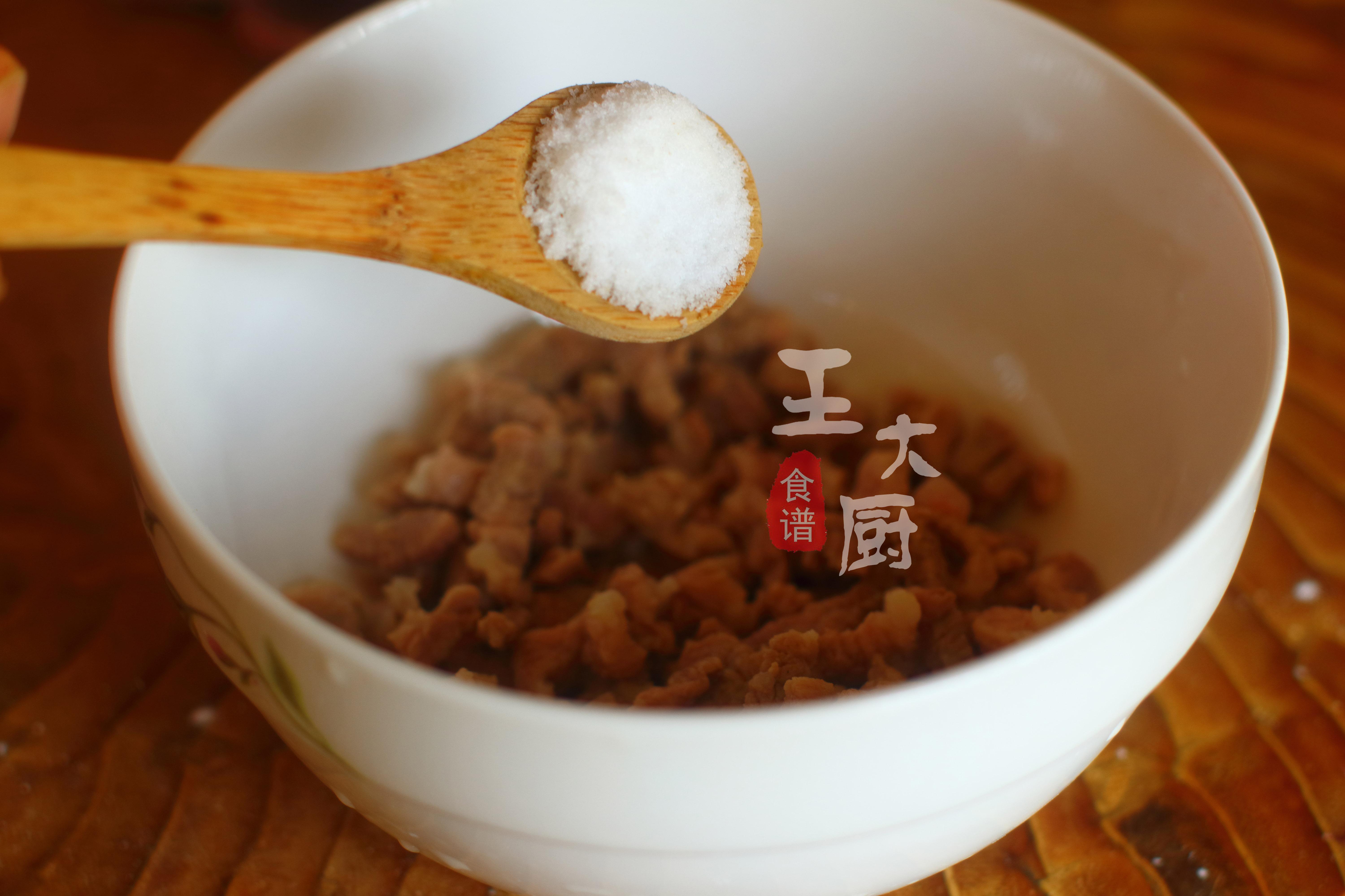 5、在瘦肉的碗中,加入一些咸鹽。