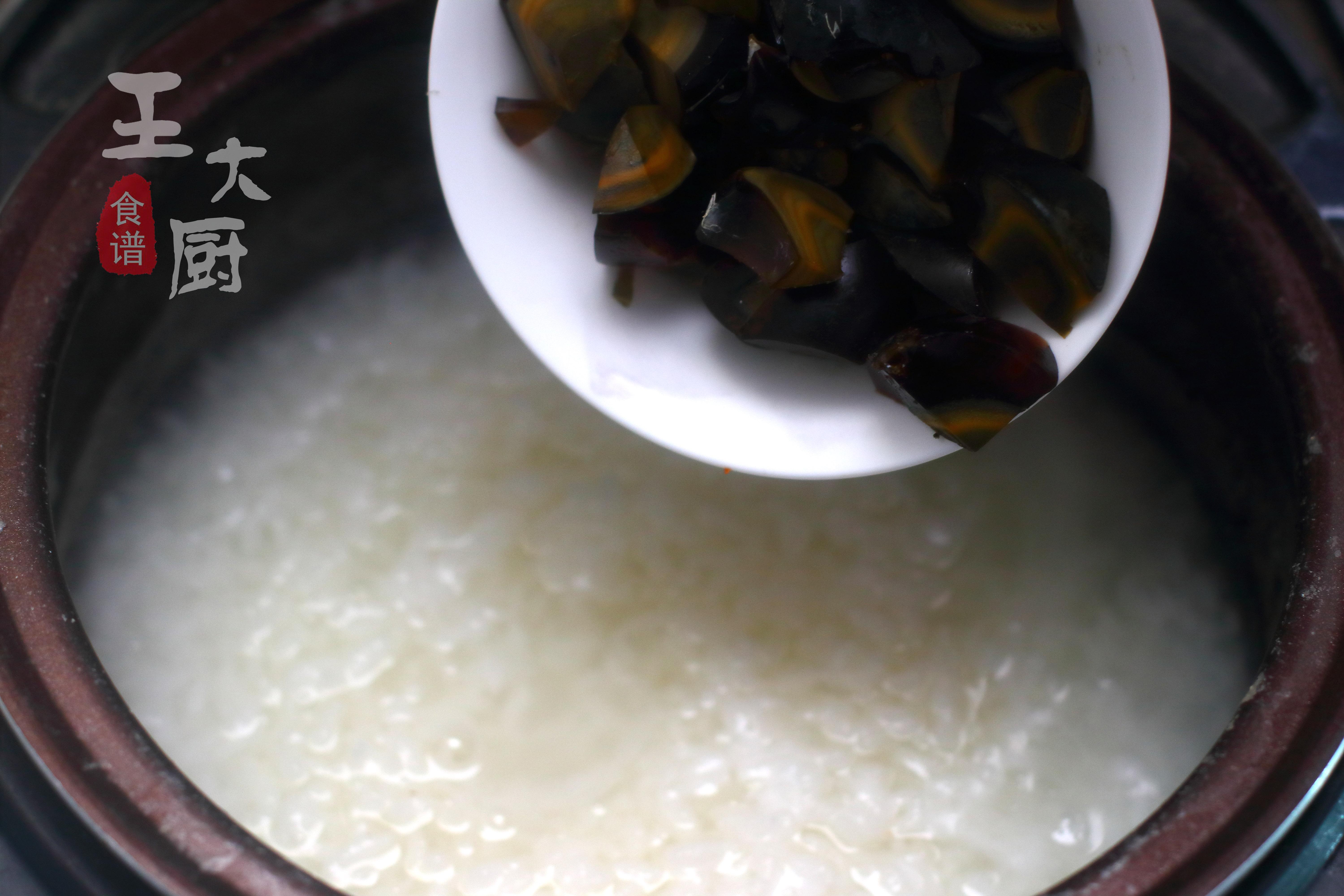 6、粥煮到一半的時候,把準備好的皮蛋放在鍋中。