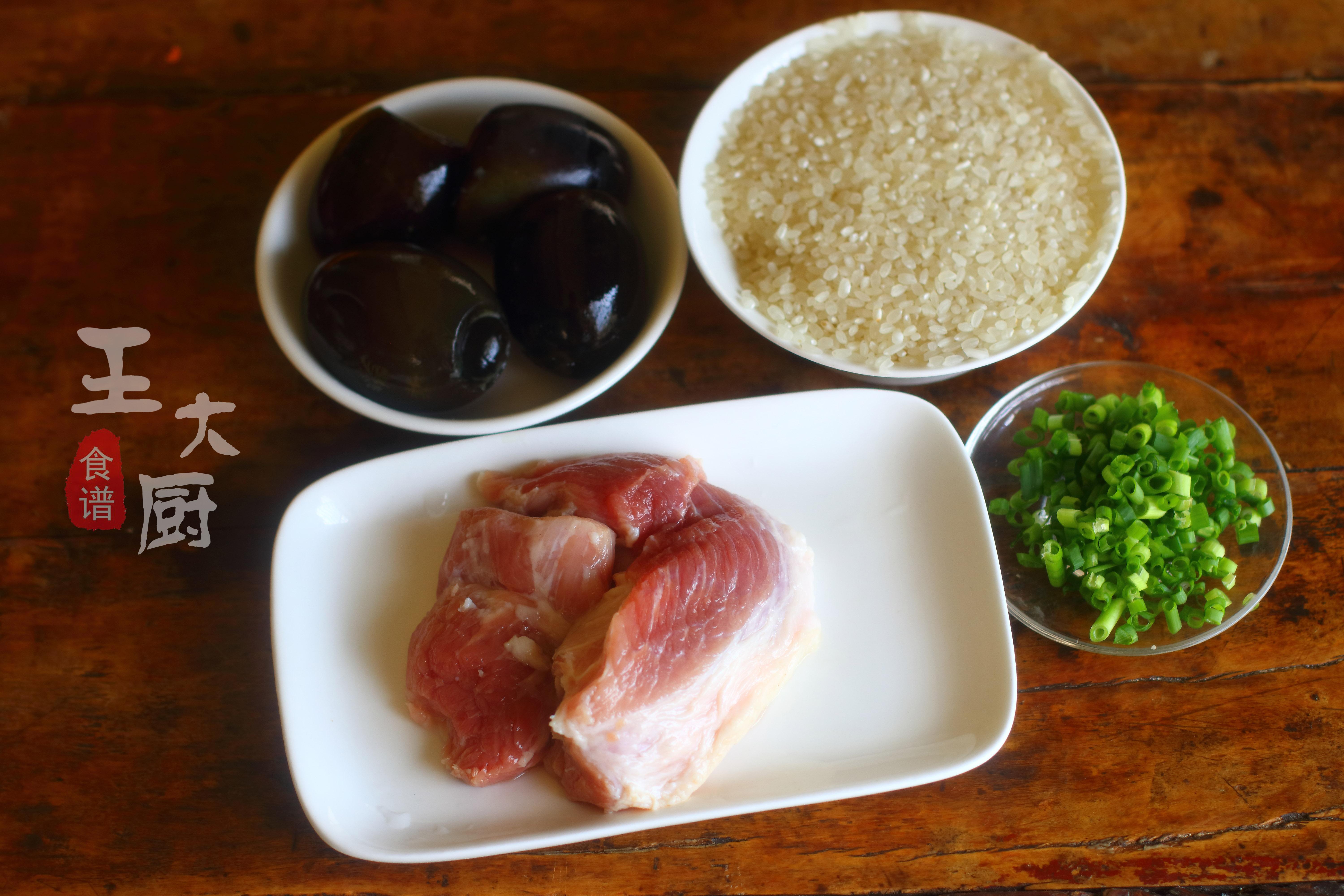 準備食材:大米、皮蛋、瘦肉、蔥花等。