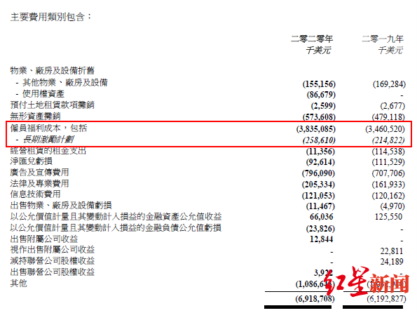 財報披露,聯想集團2019/2020財年雇員福利成本為38.35億美元,較上一財年增加3.75億美元。聯想集團全球雇員總人數63000人,較上一財年增加約6000人。紅星資本局據此計算,聯想集團雇員福利成本人均為6.09萬美元,約合人民幣43萬元。較高的福利成本也與聯想集團全球化布局有關。