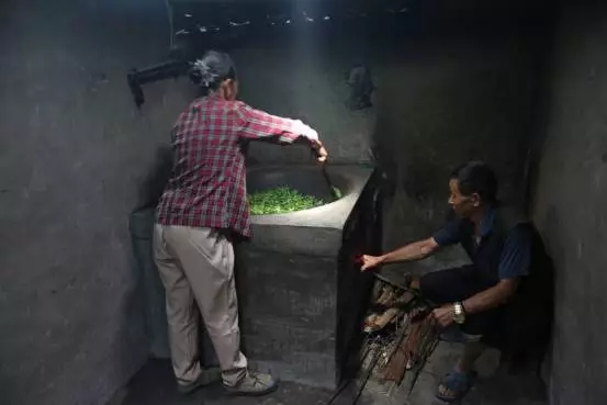 第三步:倒入鮮葉開始翻炒,掌握火候很重要。火候太大茶葉會糊掉,太小又不起作用。