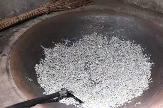 第六步:燜青完成后再次入鍋炒制一段時間,茶葉就基本快要成型了。