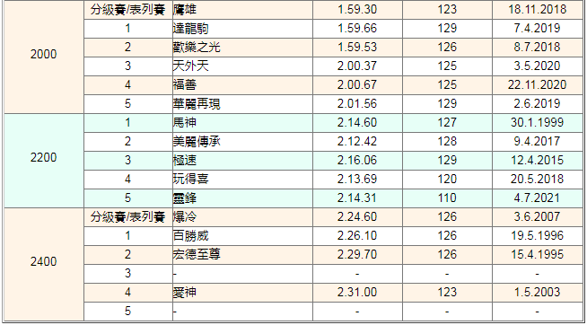 對比國外紀錄,香港地區的場地時間記錄與其非常接近。香港賽馬不僅賽事獎金豐厚,賽事水平、練馬師、騎師以至馬匹均屬世界頂流水平,廣獲國際認同,聞名全球。