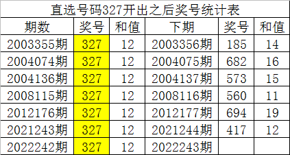 福彩3D第2022242期開出直選號碼為:327,該直選號碼歷史上出現了7次,其下期分別開出了號碼:185、682、573、560、694、417,如圖: