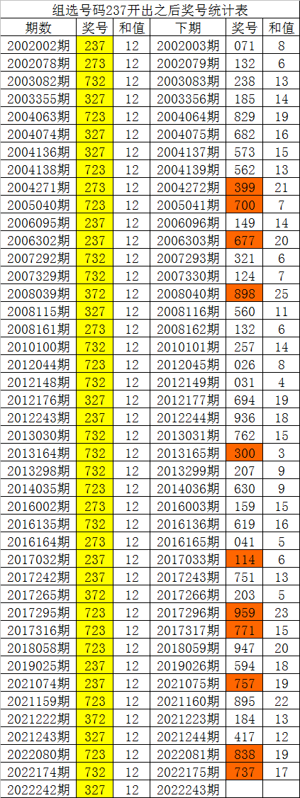福彩3D第2022242期開出組選號碼:237,該號碼歷史上組選出現了43次,其下期分別開出了號碼:071、132、238、185、829、682、573、562、399、700、149、677、321、124、898、560、132、257、026、031、694、936、762、300、207、630、159、619、041、114、751、203、959、771、947、594、757、895、184、417、838、737,如圖: