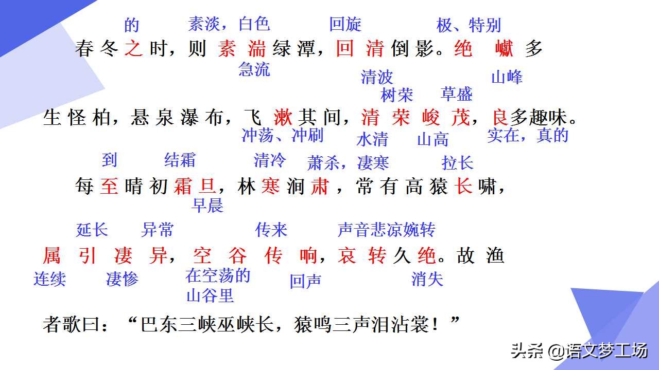 每至/晴初霜旦 故/漁者歌曰:“巴東三峽/巫峽長,猿鳴三聲/淚沾裳
