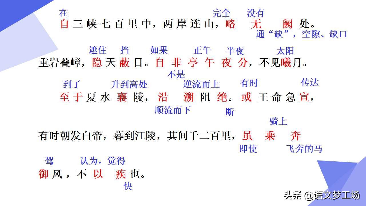 2.至于夏水襄陵,沿溯阻絕。或王命急宣 ,有時朝發白帝,暮到江陵,其間千二百里,雖乘奔御風,不以疾也。