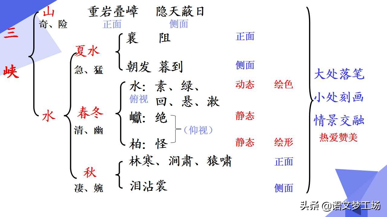 因為“峽”的意思就是兩山夾水的地方,有山才有“峽”,所以先寫山,寫山之綿長險峻是為寫水流湍急作鋪墊的,寫水的順序是根據水由旺而枯的變化過程而定的,夏天江水暴漲,最為洶涌迅疾,最具特點;同時又是承接上文寫山之險峻而來。春冬風平浪靜,秋天水枯谷干,順勢而下,入情入理。
