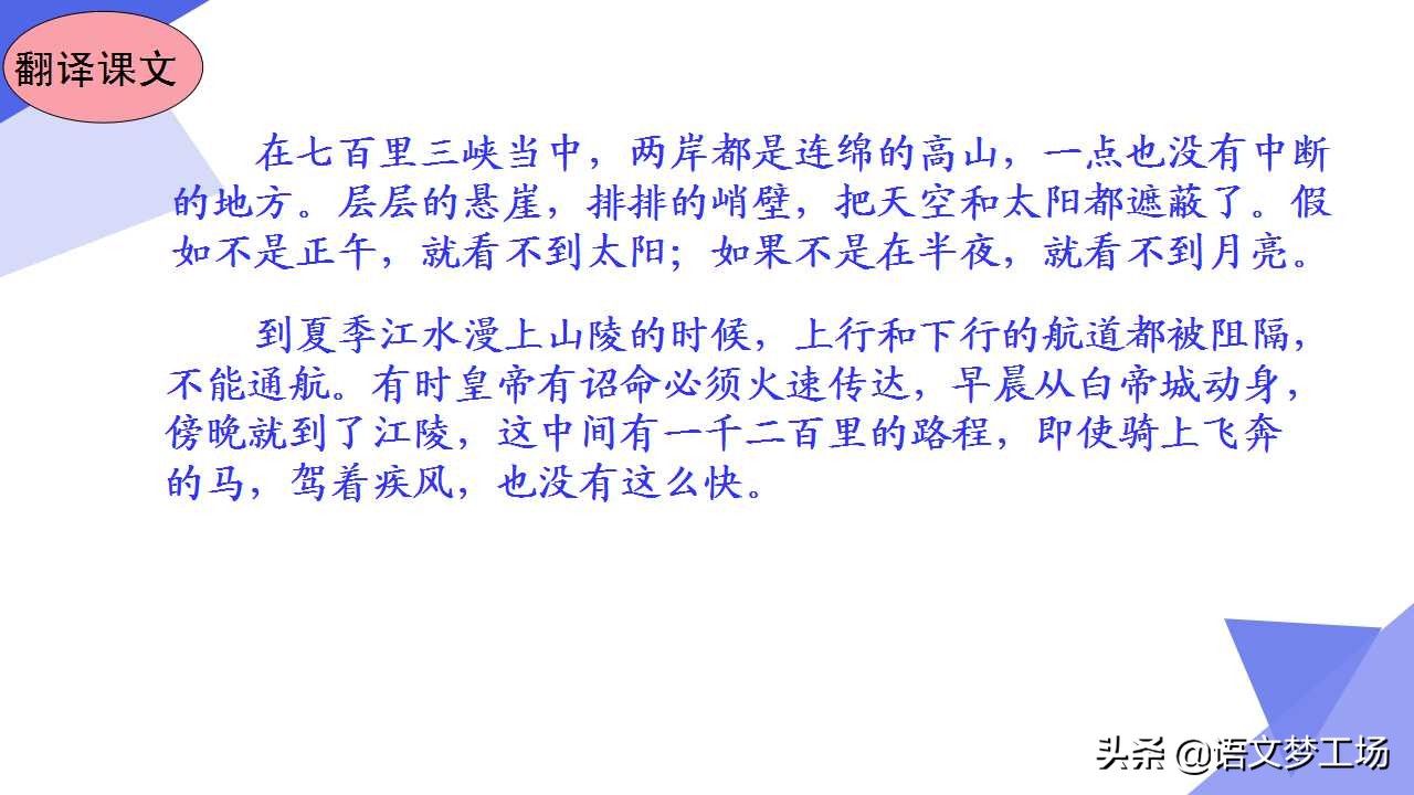 譯文:有的時候早晨(坐船)從白帝城出發,傍晚就可以到達江陵。