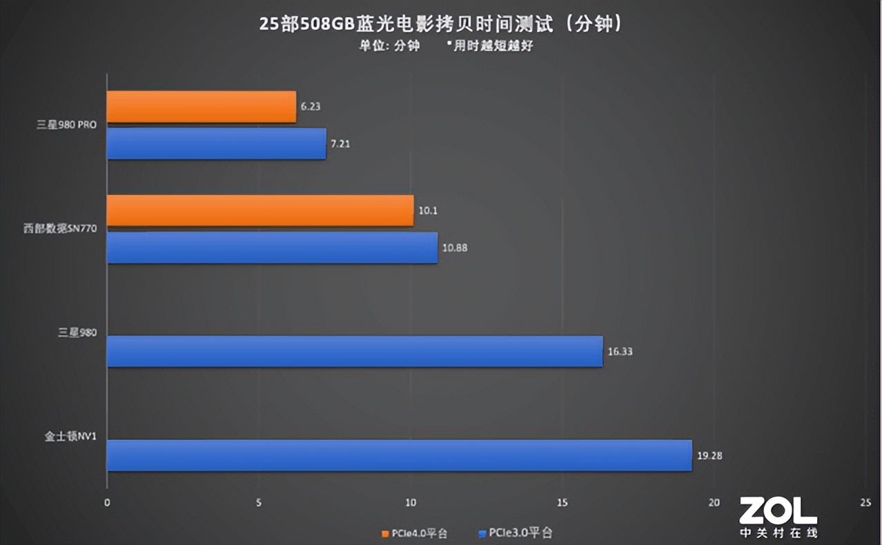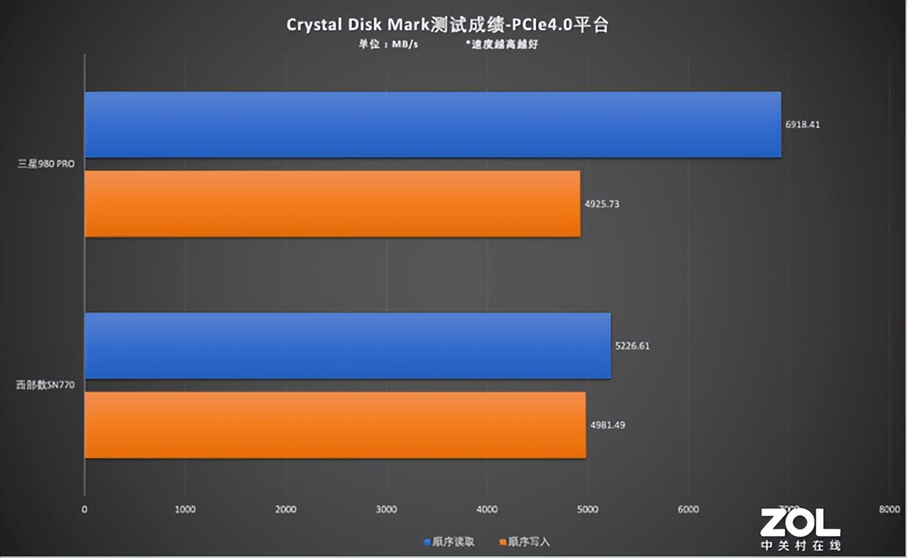 通過測試結果可知,在PCIe4.0平臺三星980 PRO用時略少于西部數據SN770,但在PCIe3.0平臺四款固態硬盤的用時差異也非常小,可見PCIe4.0固態硬盤下放到PCIe3.0平臺未必會有優勢。那么在理論測試中,這四款固態硬盤的表現又如何呢?