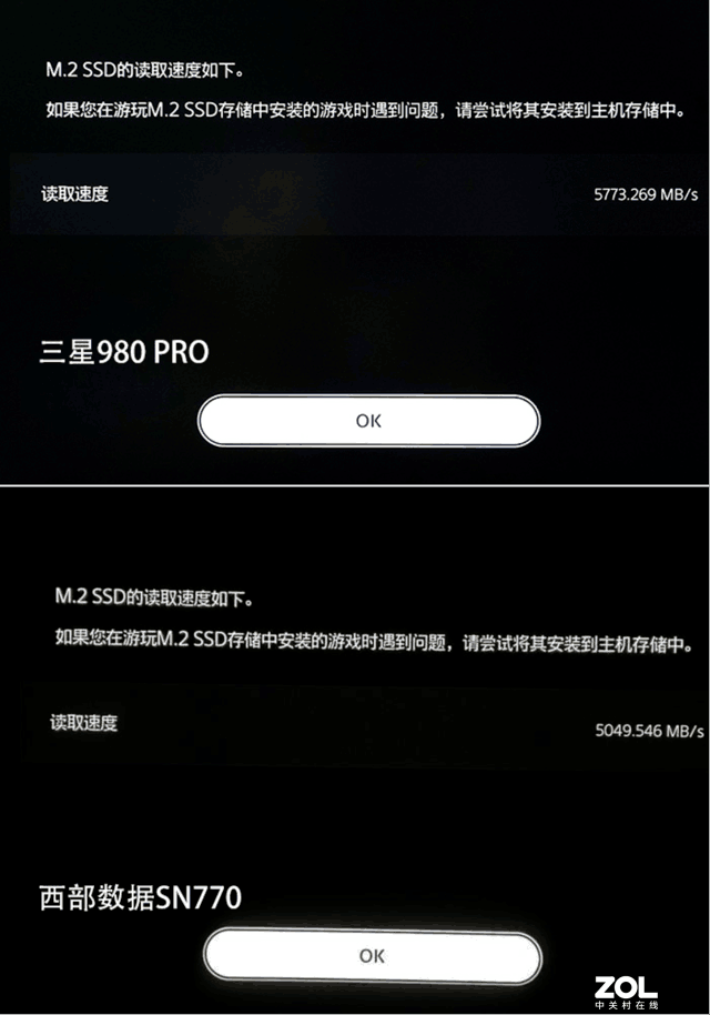 為PS5擴容固態硬盤后,開機會要求格式化并進行測速,三星980 PRO測試速度為5773MB/s,而西部數據SN770測速僅有5049MB/s,低于索尼推薦的5500MB/s,在游戲的轉存方面可能會略微影響體驗。