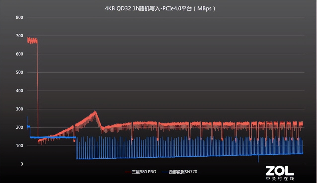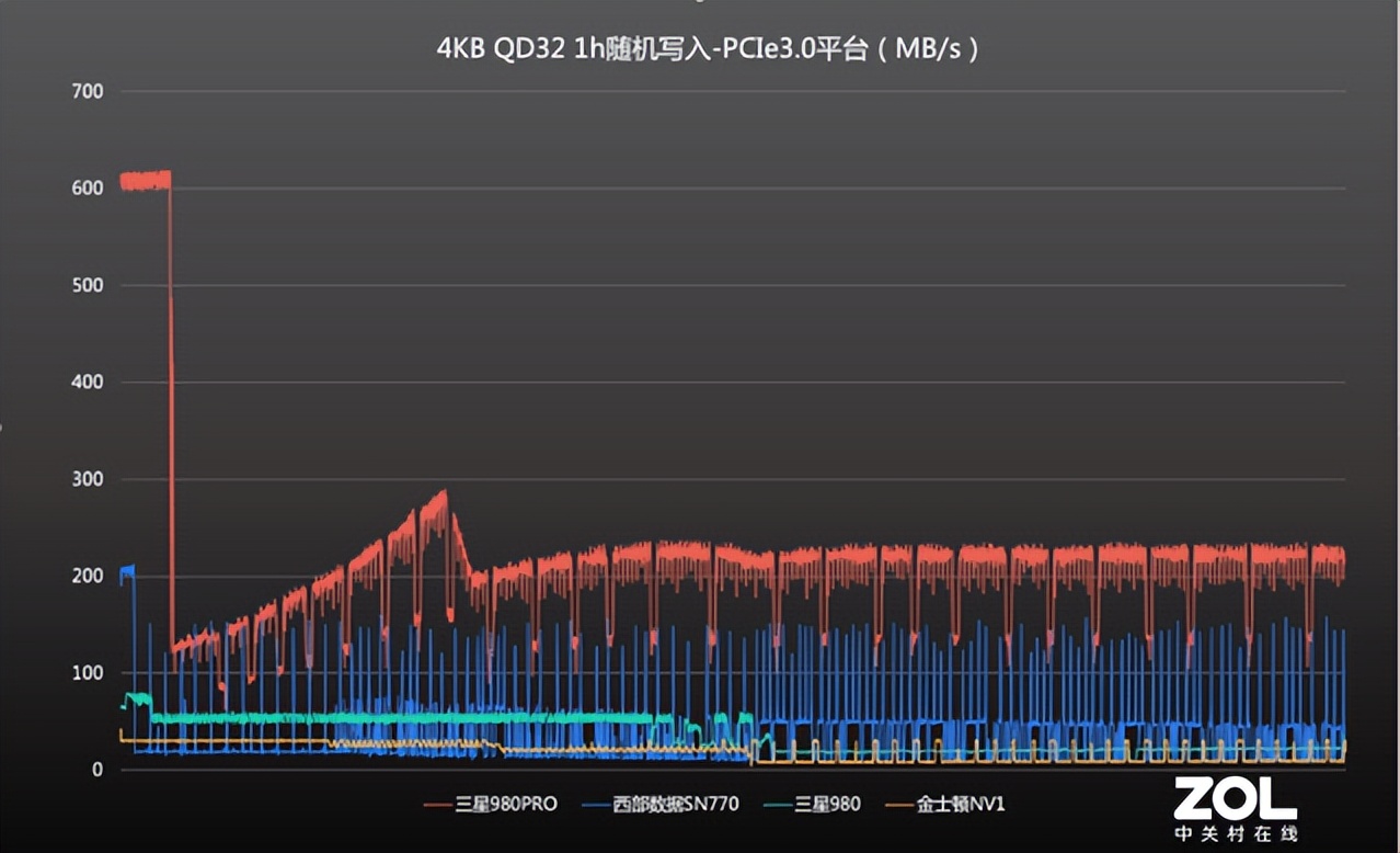在PCI3.0平臺,三星980 PRO的4K隨機測試成績穩固榜首,最高在610MB/s左右,緩存用盡后回落至130MB/s,并逐漸爬升,從30%起密集速度區間在220?230MB/s;