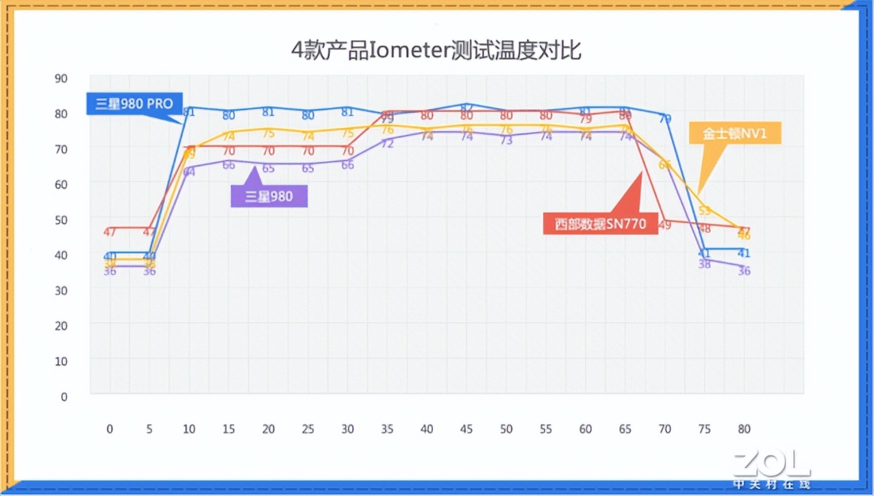 同樣采用三位一體散熱措施的三星980最高溫度為74℃,15分鐘溫度降幅也達到36℃,可見其控溫能力非常優秀,測試完成后也迅速回落到36℃待機溫度;