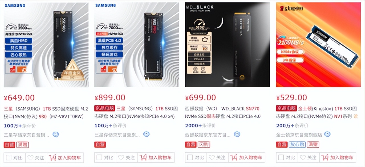 參與本次橫評的三星980 PRO和西部數SN770為PCIe4.0產品,三星980和金士頓NV1為PCIe3.0產品,這四款產品均能代表PCIe3.0和PCIe4.0每檔產品的性能。(價格有浮動,僅供參考)
