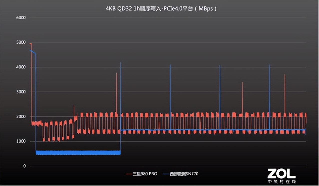該項測試的圖表看起來可謂“壯觀”,三星980 PRO緩存用盡后速度也有所回落,但在動態散熱保護(DTG)機制下,擁有1400?1500MB/s和2000?2100MB/s兩段密集的速度區間,可見在PCIe3.0平臺下依然保持較高的性能水準;