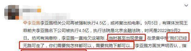 離婚之后,王菲又和謝霆鋒重新走在了一起,而李亞鵬卻一直負面消息不斷。先是因為投資房地產失敗,一度被告上法院,遭索賠4000萬人民幣,之后又被曝出和他相關的投資公司,再次被強制執行4.5億。