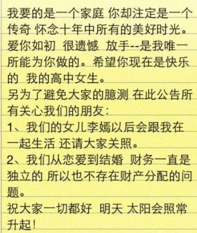 而李亞鵬則寫道:“我要的是一個家庭,你卻注定是一個傳奇。”
