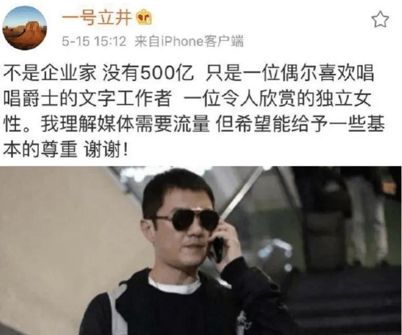 不過對此,李亞鵬進行了辟謠,他寫道:“不是企業家,沒有500億,只是一位偶爾喜歡唱唱爵士的文字工作者,一位令人欣賞的獨立女性。”