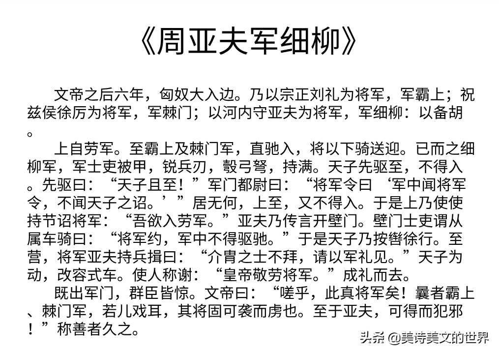 2. 《周亞夫軍細柳》這篇散文同樣出自《史記》,同樣是司馬遷所寫,情節也一樣吸引人,但篇幅卻更加精悍,初中生更容易理解。