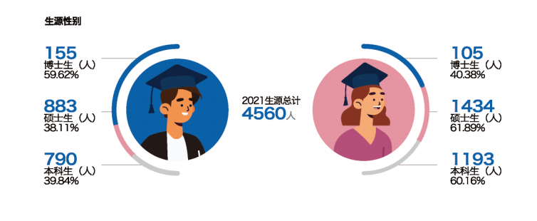 上海高校規模普遍不大,作為財經類高校的上海財經大學,2021屆本科畢業生只有1983人,其中女生人數占比超過60%,達到了1193人。