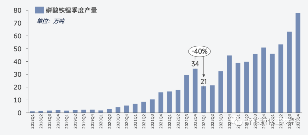 2023年一季度磷酸鐵鋰的產量為21萬噸,較2022年4季度的34萬噸,環比下降40%。