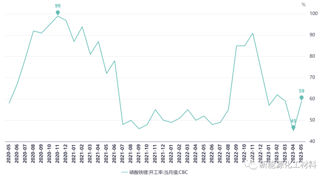 上半年磷酸鐵鋰開工率一路向下,從去年11月的91%下降至4月的45%,5月份有所回升,但仍在60%以下。