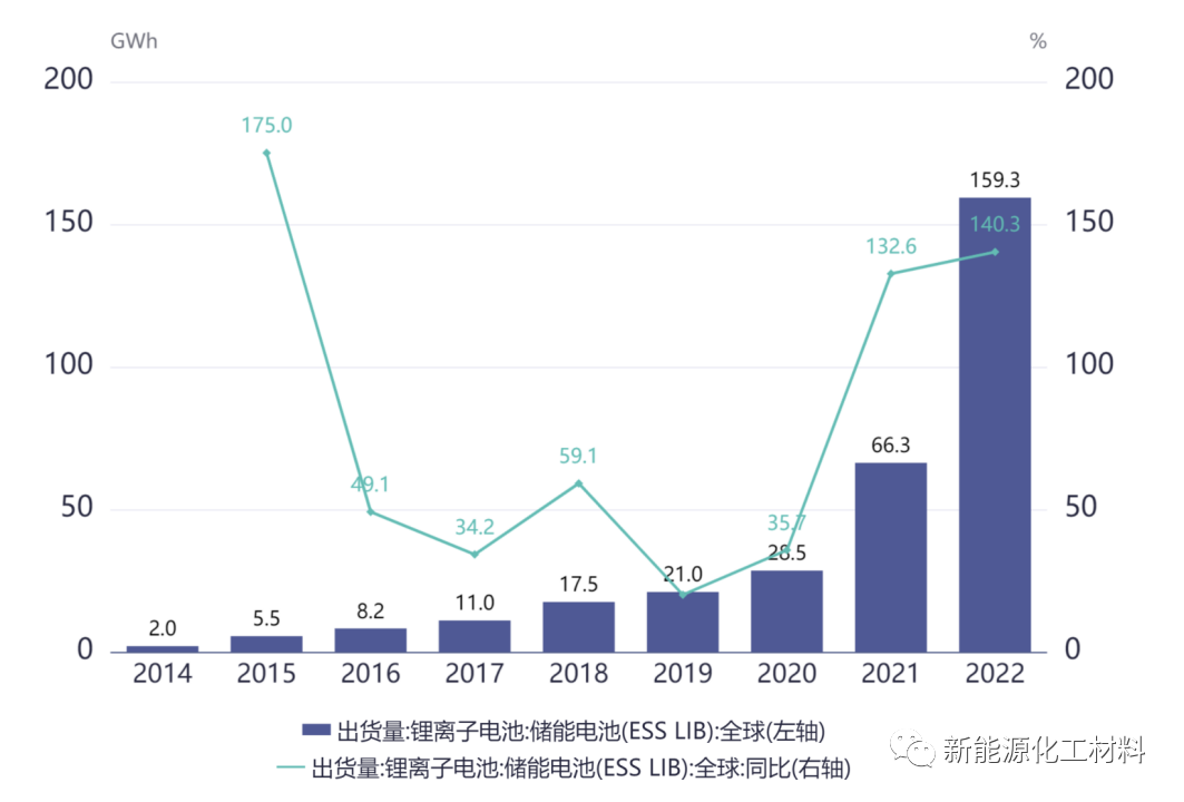 全球儲能鋰電池年度出貨量及同比增速