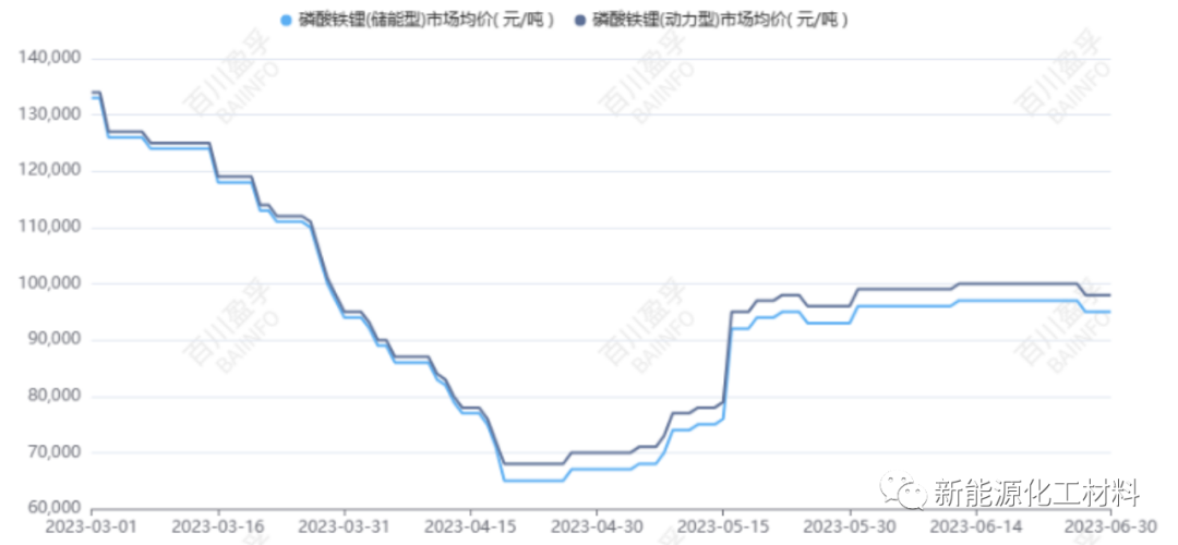 截止6月30日,動力型磷酸鐵鋰均價10萬元/噸,較年初降6.6萬元/噸,儲能型磷酸鐵鋰均價9.7萬元/噸,較年初價格降6.4萬元/噸,跌幅均在40%。