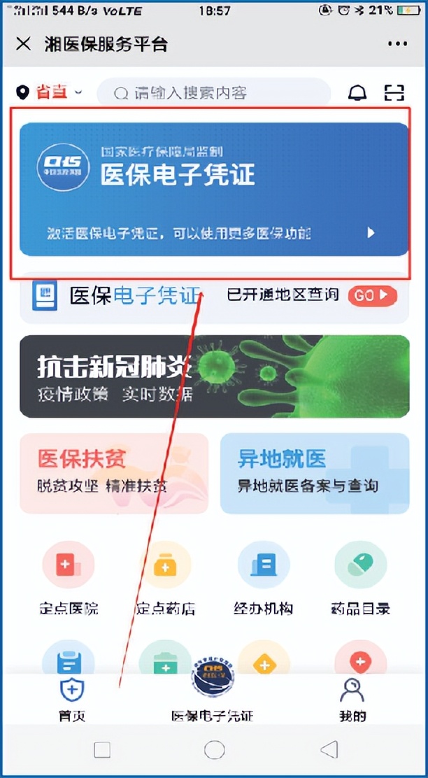 第二步:關注后點擊右下角菜單欄的“湘醫保”—“湘醫保服務平臺”;接著點擊頁面中的“醫保電子憑證”;