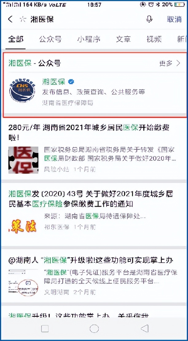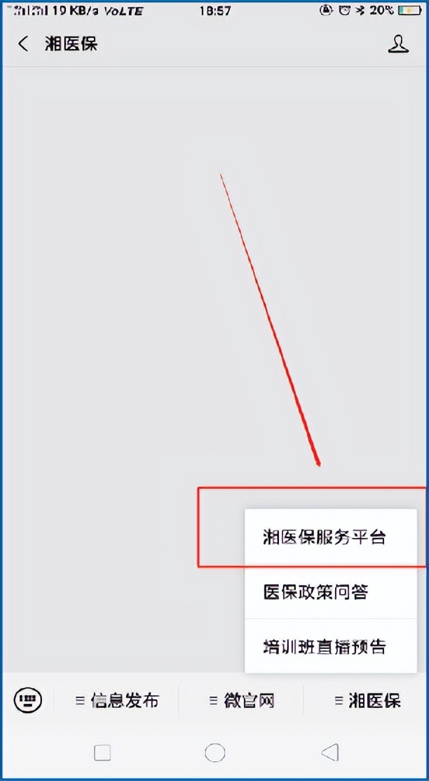 第一步:微信搜索“湘醫保”公眾號并關注,點擊如下圖所示區域即可進入關注;