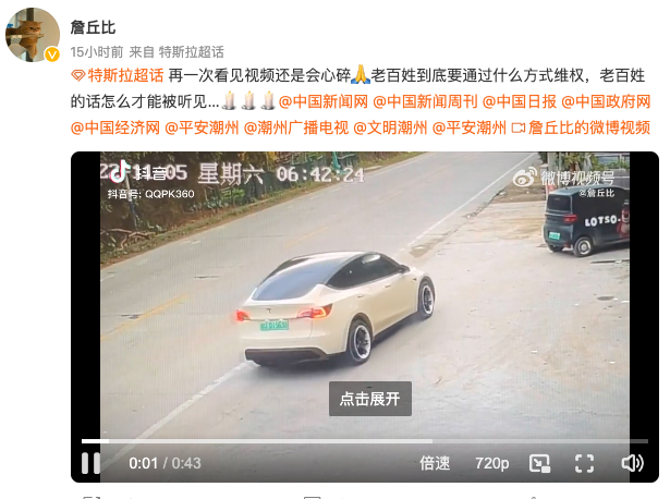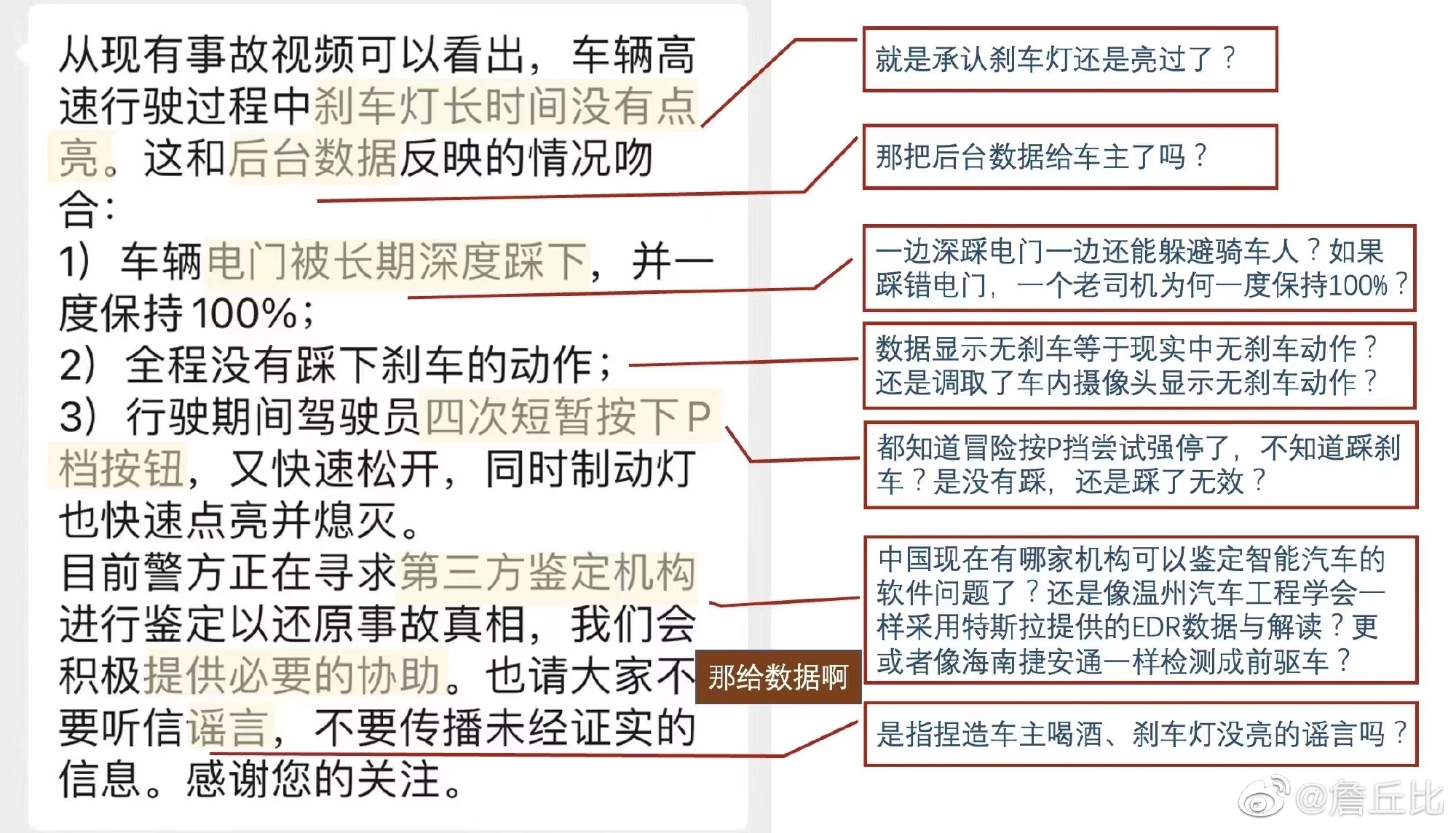 對于特斯拉給出的后臺數據結果,“詹丘比”第一時間在其微博上提出了質疑。如,針對特斯拉回應的“車輛電門被長期深度踩下”問題,“詹丘比”質疑稱:“(事故車主)一邊深踩電門一邊還能躲避騎行車輛?如果錯踩電門,一個老司機為何一度保持100%。”