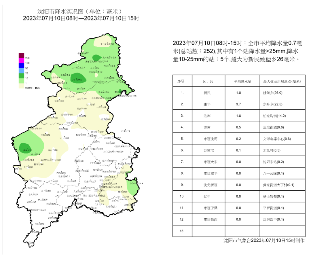 7月10日8時至15時雨情(mm):全地區平均降水量0.7,最大值26(新民姚堡鄉),最大小時降水量26(新民姚堡鄉,14時至15時);城區平均降水量0.0,最大值0.8(沈河文翠電器中心),最大小時降水量0.8(沈河文翠電器中心,11時至12時)。