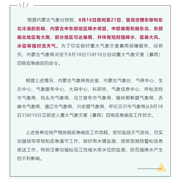 18日,根據內蒙古氣象臺預報,內蒙古啟動重大氣象災害(暴雨)四級應急響應↓↓↓