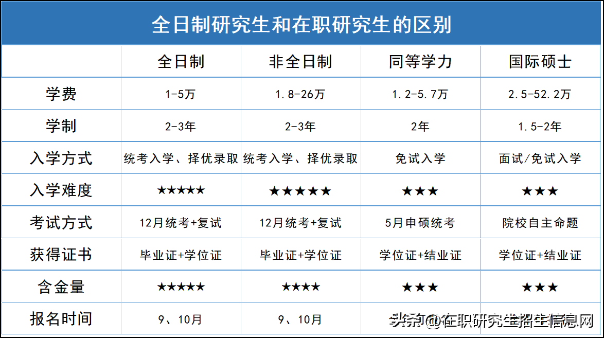 全日制研究生:全日制研究生是周一至周五在校學習的方式,報考人員多為應屆本科畢業生和想重回校園讀研的在職人員。