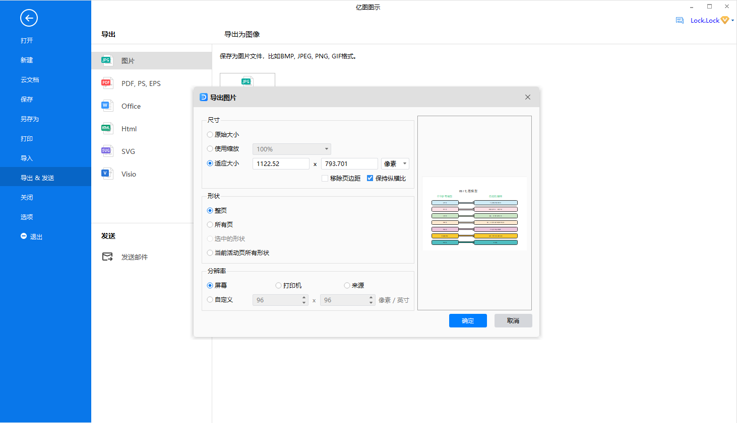 第五步:第四步做完,OSI七層模型就基本完成了,點擊左上角分享形狀按鈕,進入下圖界面,本次選擇圖片保存格式,修改圖片的各項屬性,點擊確定保存。