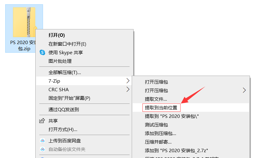 導讀準備工作1、提前準備好ps2020軟件安裝包2、系統必須是Windows 10 64bit3、保證電腦中有任意一款解壓軟件安裝步驟1.找到下載好的安裝包,并將其解壓到當前位置2.
