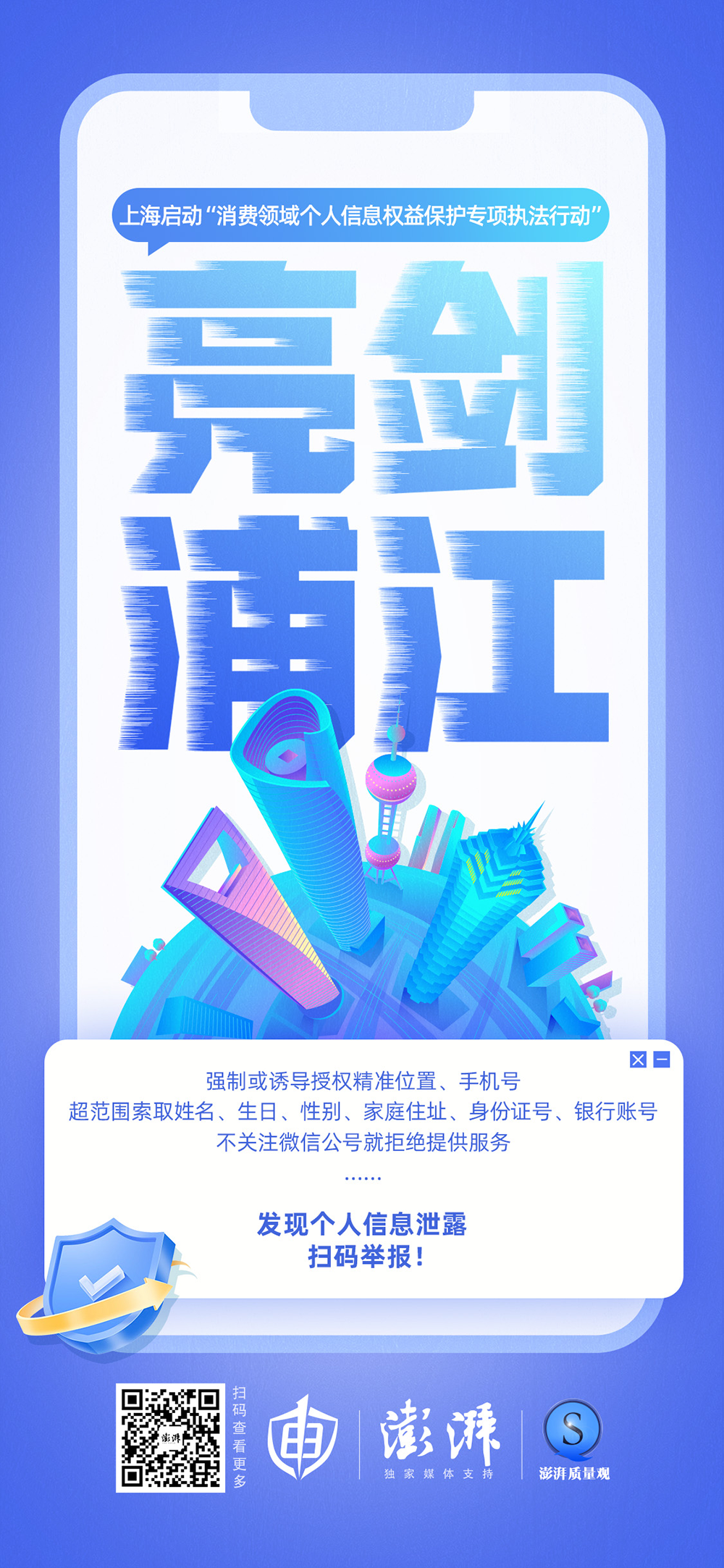 針對個人信息保護相關亂象,回應網民關切,6月16日,上海市網信辦、市市場監管局共同啟動“亮劍浦江·消費領域個人信息權益保護專項執法行動”。專項行動為期半年,將聚焦餐飲店、停車掃碼、少兒學習培訓等八類重點消費領域,對個人信息領域的“過度采、強制要、誘導取、違規用”等違法行為開展集中整治。