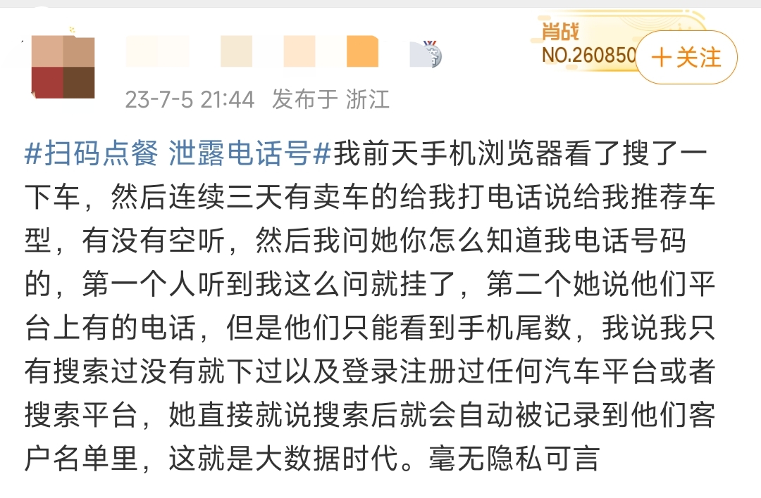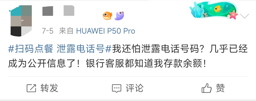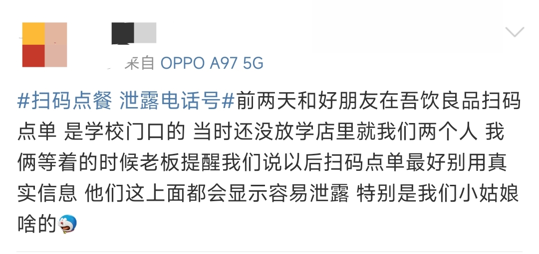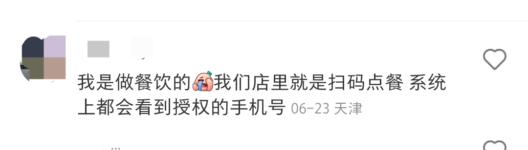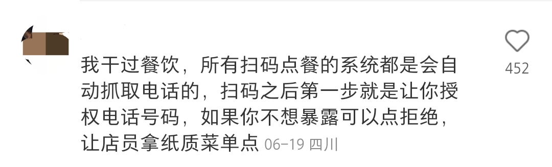對此,部分聲稱做過餐飲的網友解釋稱,“我是做餐飲的,我們店里就是掃碼點餐,系統上都會看到授權的手機號”“我干過餐飲,掃碼之后第一步就是讓你授權電話號碼,如果你不想暴露可以點拒絕,讓店員拿紙質菜單點”“我以前當服務員的時候就通過這個找到過好幾桌沒結賬就走的客人”“餐飲兼職過,掃碼點餐確實能看到電話的,有的客人忘記結賬就需要打電話聯系,我們也會為了五星好評給客人送飲料,但做的不好吃還求人家改評價確實很......”