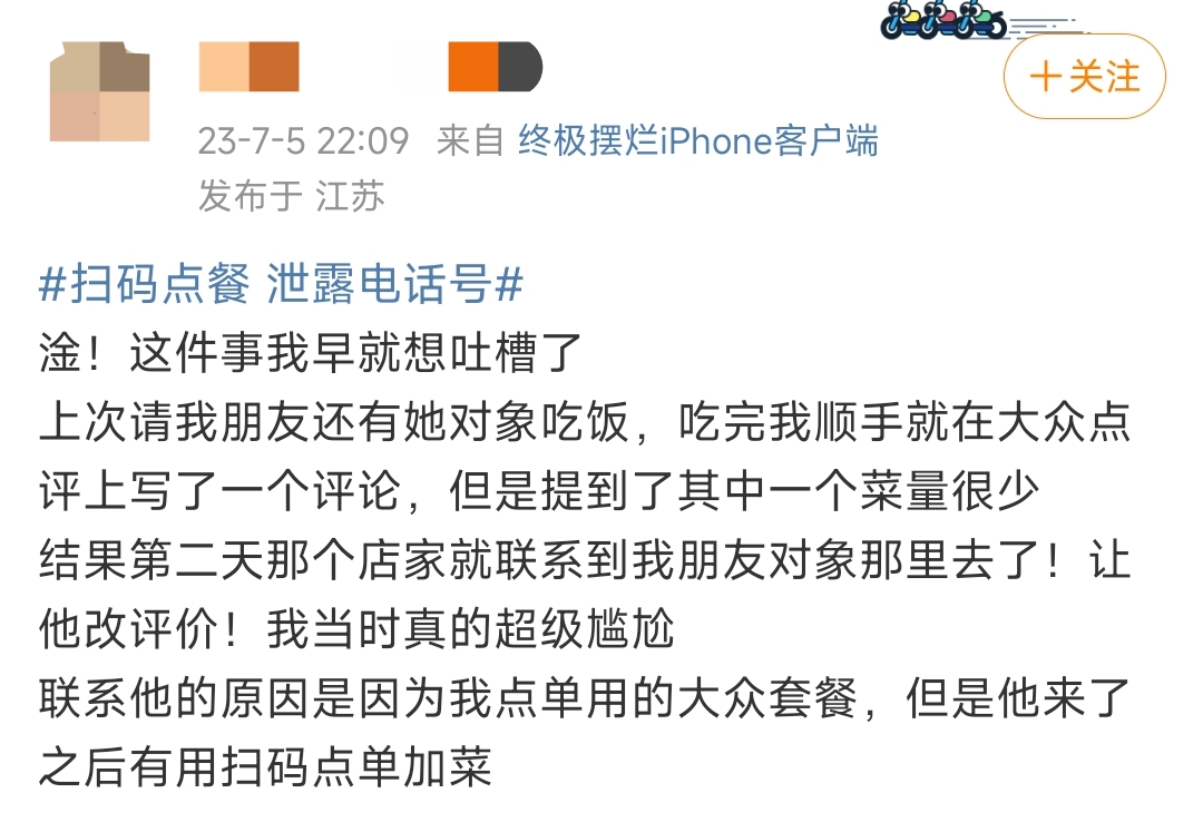 就餐體驗帖經披露后,評論區下網友紛紛吐槽自己遭遇到的個人信息泄露情況。澎湃新聞梳理發現,網友們的吐槽主要針對兩方面,首先是掃碼點餐后,餐廳可以通過點餐時授權的手機號聯系到消費者本人;其次對餐廳評價之后,商家依然可以找到消費者要求刪評或更改評價。