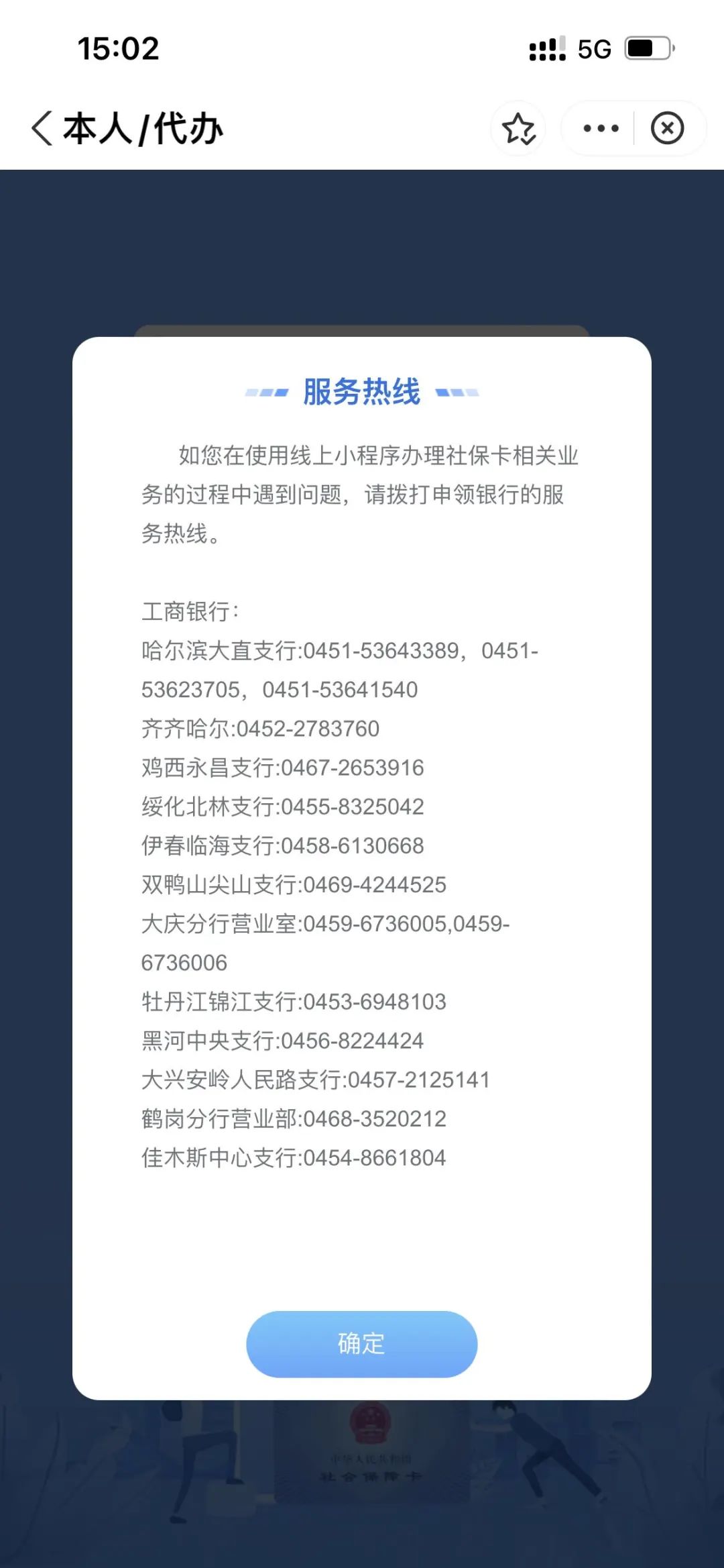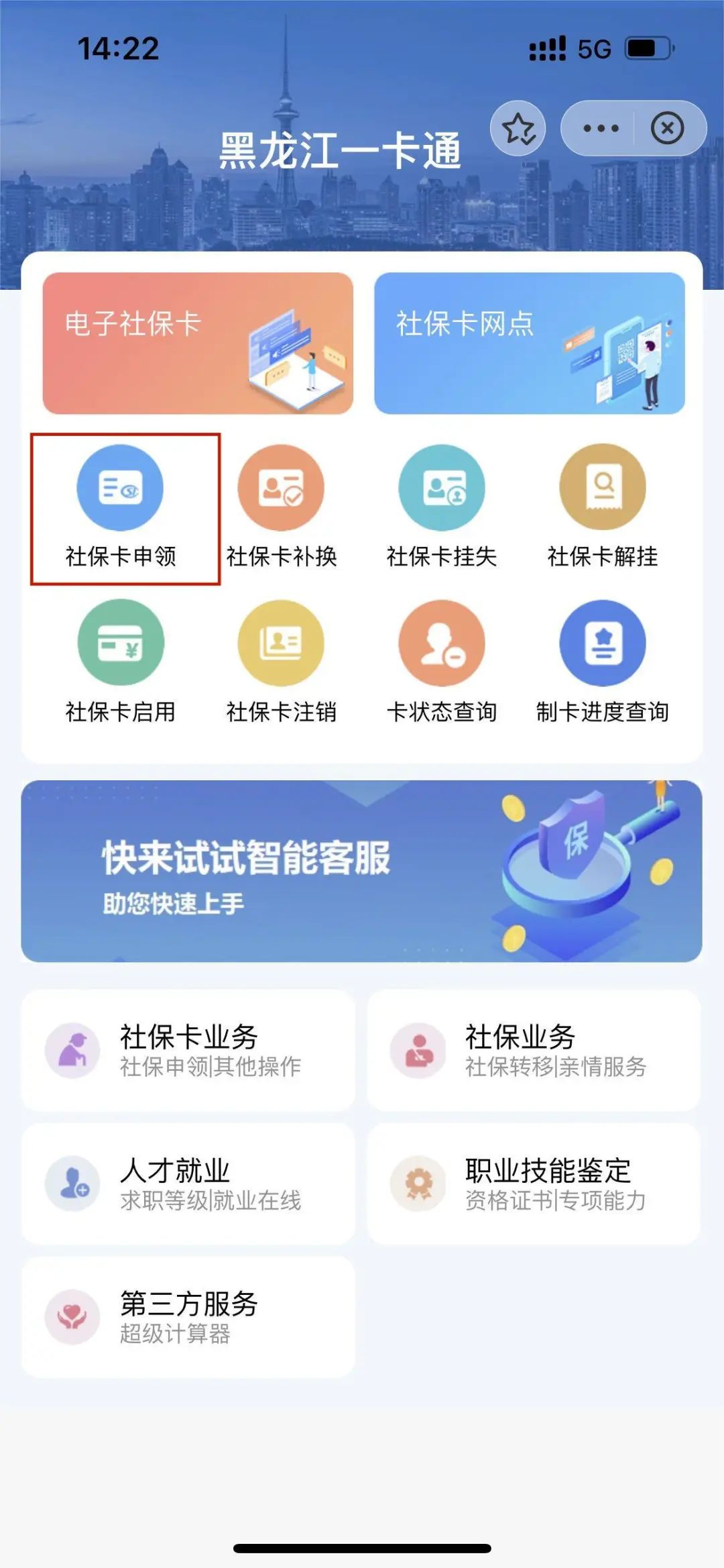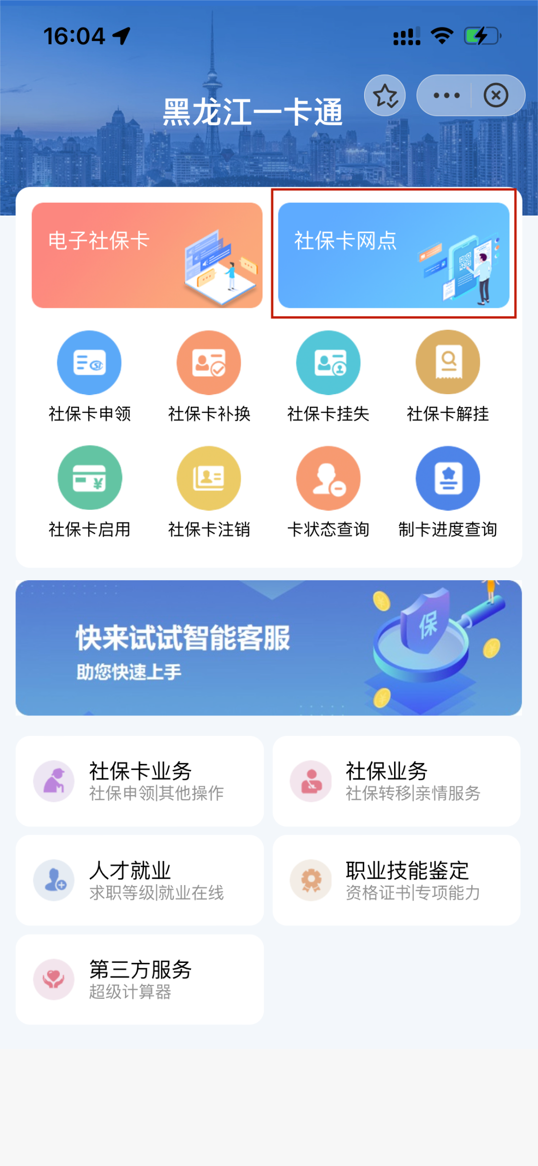 進入“黑龍江一卡通”小程序首頁,提供社保卡申領、補換、掛失、解除掛失、啟用、注銷、查詢以及“電子社保卡”申領、社保卡網點查詢等功能。如使用中遇到問題,請點擊底部“服務熱線”致電對應銀行咨詢。