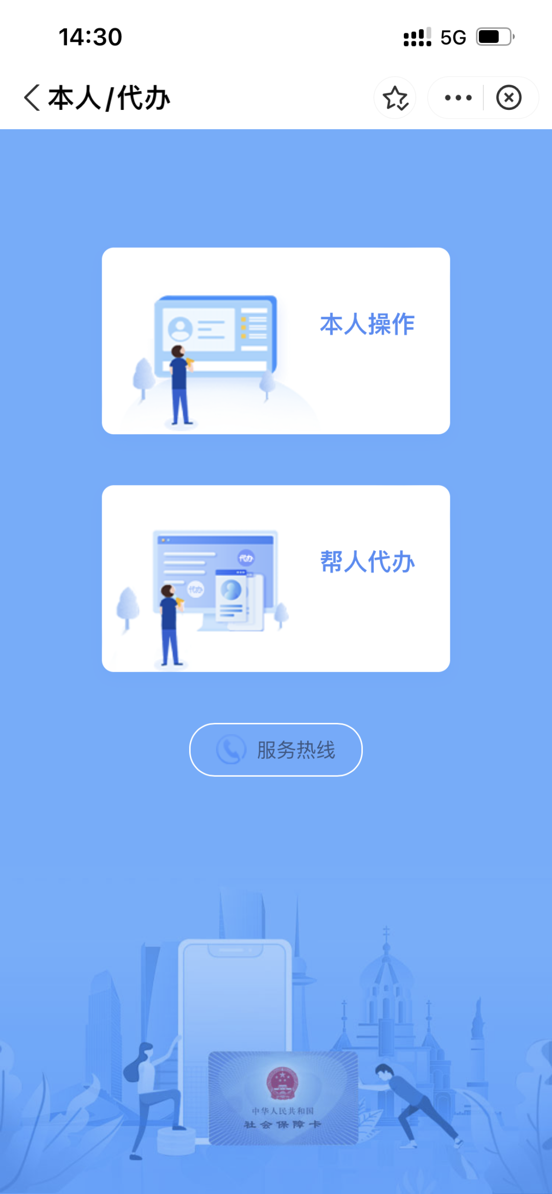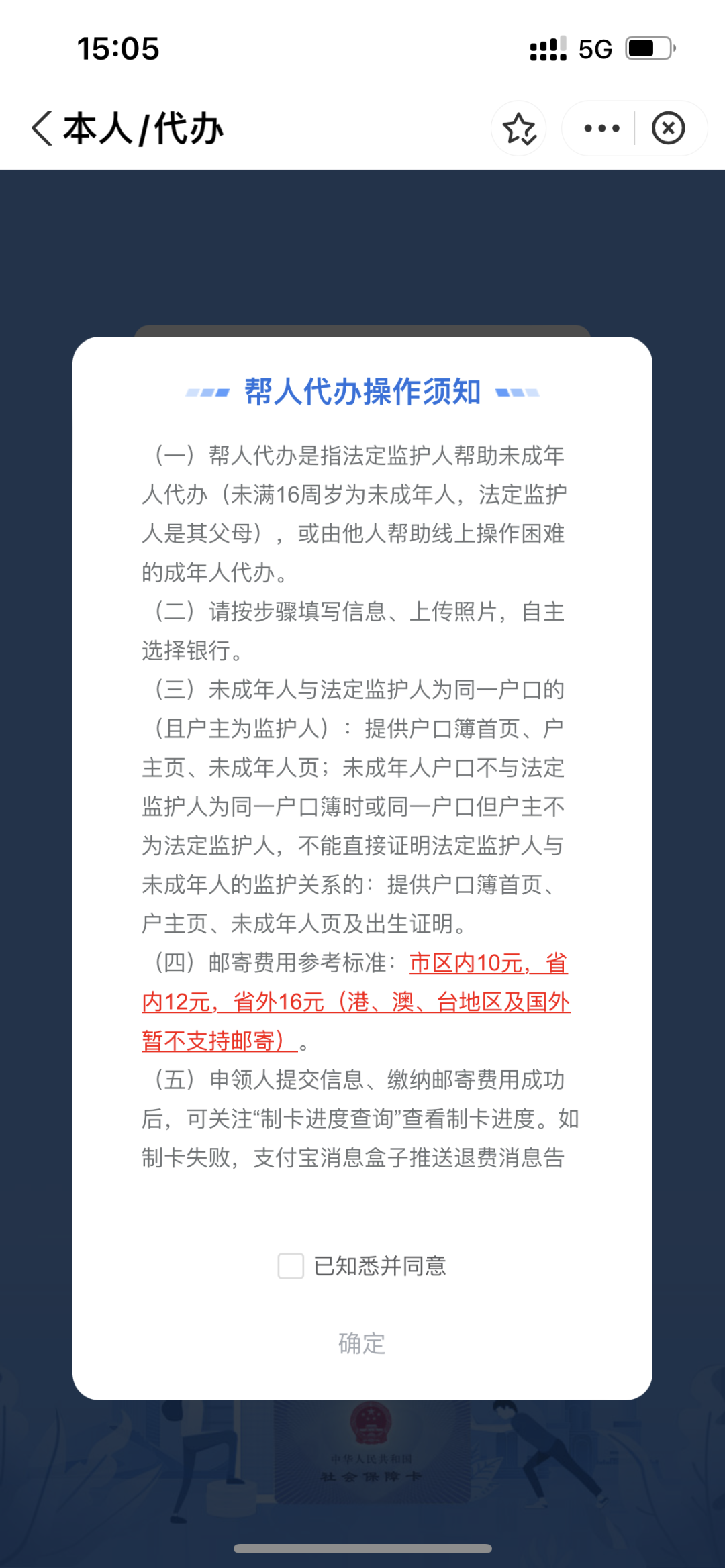 點擊首頁中“社保卡申領”,“本人辦理”或“幫人代辦”閱讀辦理須知,確認辦理。