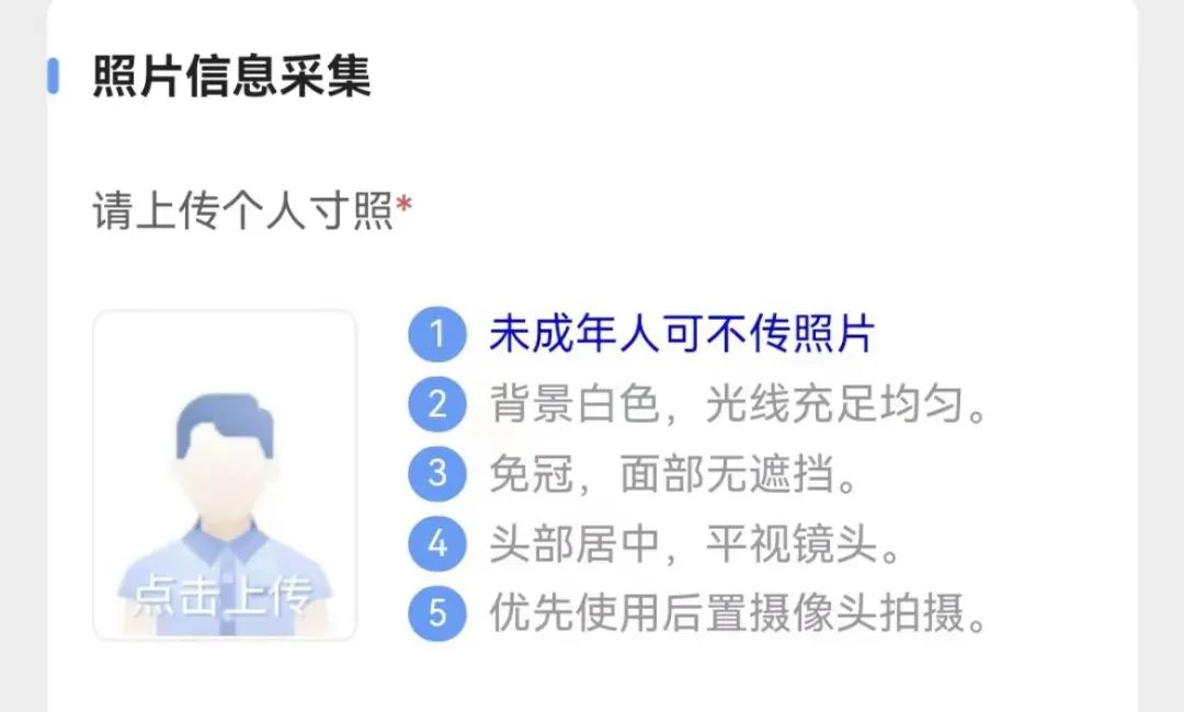 系統支持拍照上傳和證件照上傳兩種方式(如未成年人無法拍照,可不上傳照片信息,系統將使用默認照片進行制卡,不影響其正常使用)。