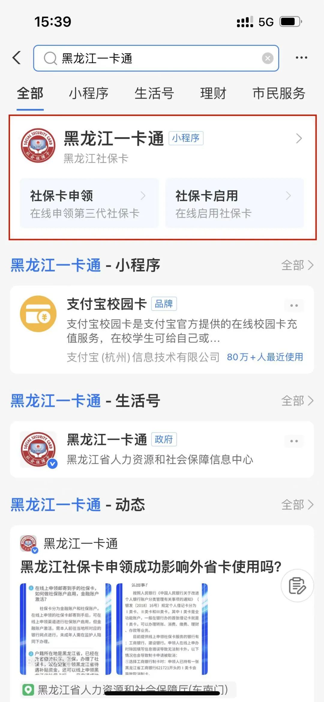 申請人通過 “支付寶”APP搜索“黑龍江一卡通”,進入黑龍江一卡通主頁。
