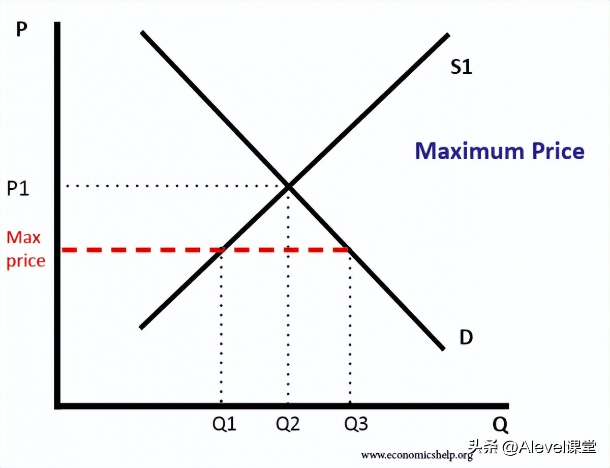 - However, the problem of a maximum price is that there will be a shortage. At Max Price, Demand is greater than supply. (Qe-Q1) This leads to queues and consumers unable to buy. 然而,最高價格的問題是,會出現短缺。在最高價格下,需求大于供給。(Qe-Q1)這導致了排隊,消費者無法購買。
