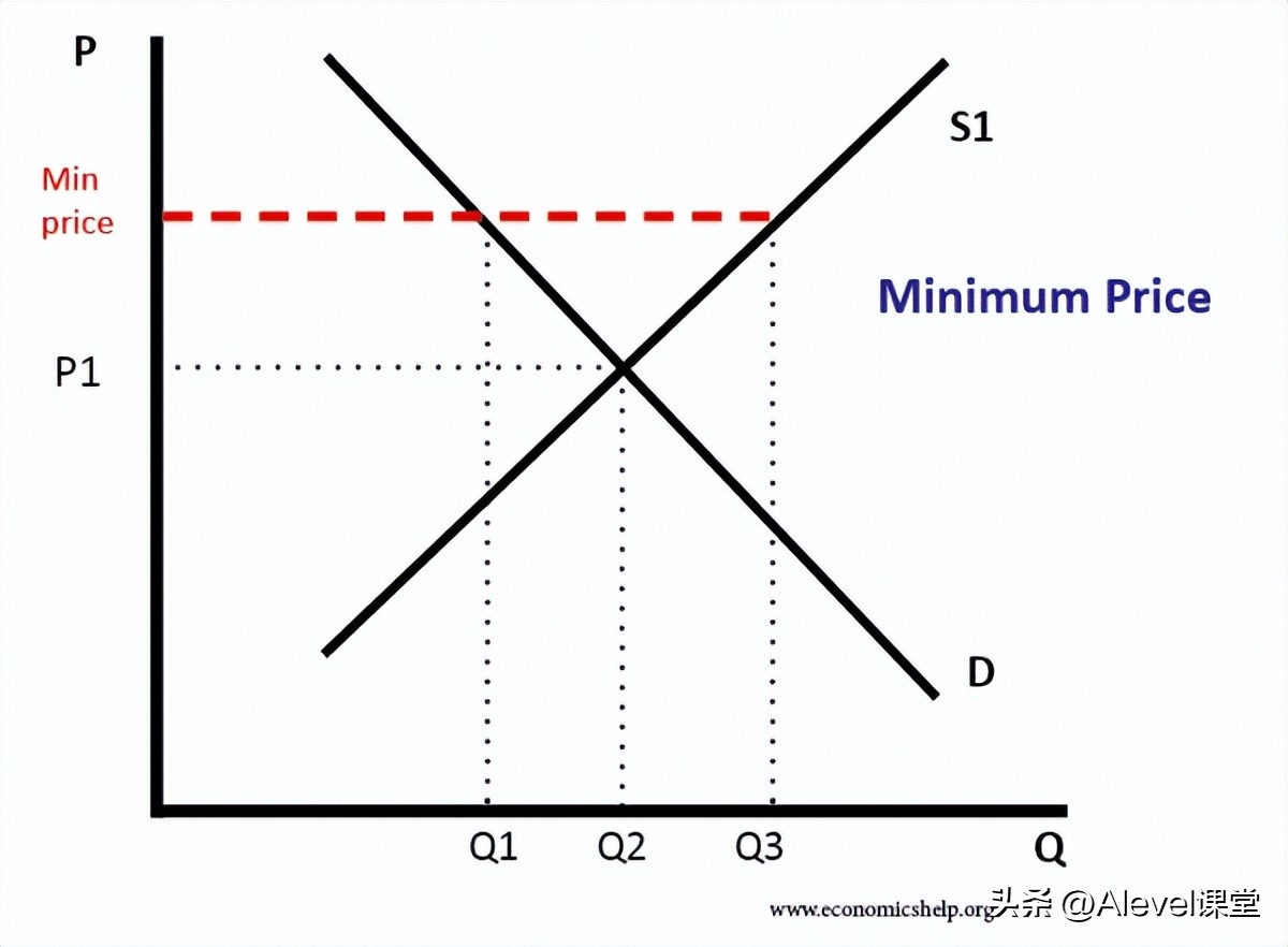 A minimum price will lead to a surplus (Q3 – Q1). Therefore the government will need to buy the surplus and store it. Alternatively, it may impose quotas on farmers to decrease the quantity of the good put onto the market.
