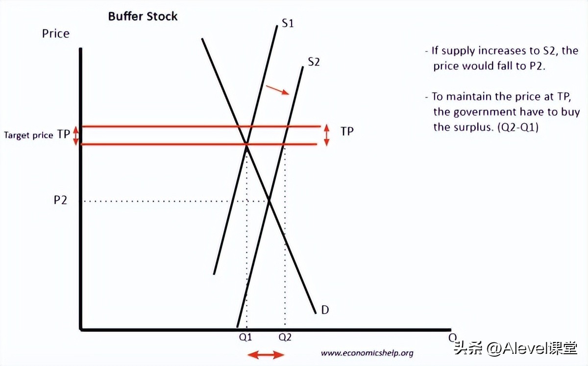 Therefore the government may feel there is a case to intervene and stabilise prices. A buffer stock involve a combination of minimum and maximum prices. The idea is to keep prices within a target price band. 因此,政府可能認為有必要進行干預并穩定價格。緩沖庫存涉及最低和最高價格的組合。其目的是將價格保持在一個目標價格范圍內。