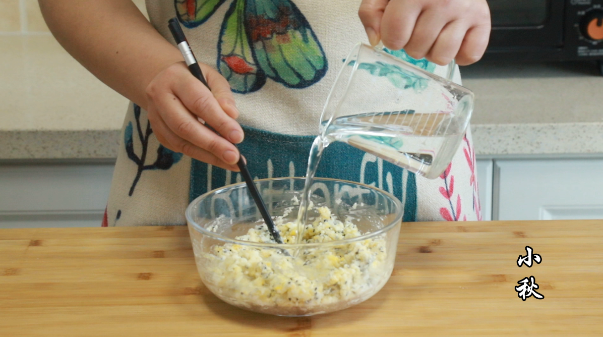 1,我這一袋是250克的,這個麻薯粉里面有一點顆粒,先用手把它搓散,后在里面打一個雞蛋,加30克玉米油,適量的黑芝麻,然后用175克清水和面