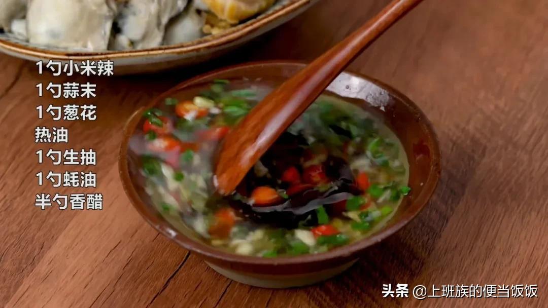 調一個秘制小蘸醬:1勺蒜末、1勺小米辣、1勺蔥花、熱油、1勺生抽、1勺蠔油、半勺香醋,攪攪勻。